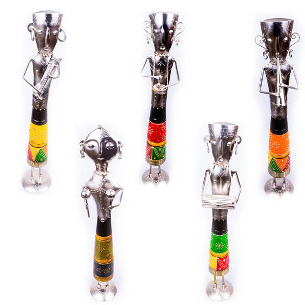 This Set of 5 Decorative Tribal Female Musician Metal Dolls Playing Instruments with antique work is sure to add to the visual opulence of your home décor with its rich design and fine execution.