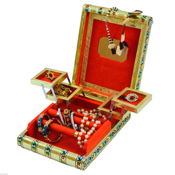 This metallic sheet on this wooden Meenakari jewellery box with Meenakari work is the best choice for keeping all your valuable jewellery because of its sturdy and yet aesthetically refined design.
